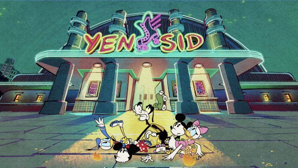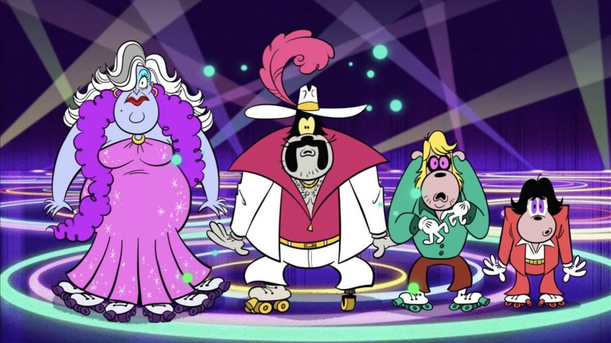 Enjoying a magical night at their favorite roller disco, Mickey, Minnie, Donald, Daisy and Goofy request a favorite tune from DJ Yensid (the sorcerer from Fantasia), who also owns the joint.