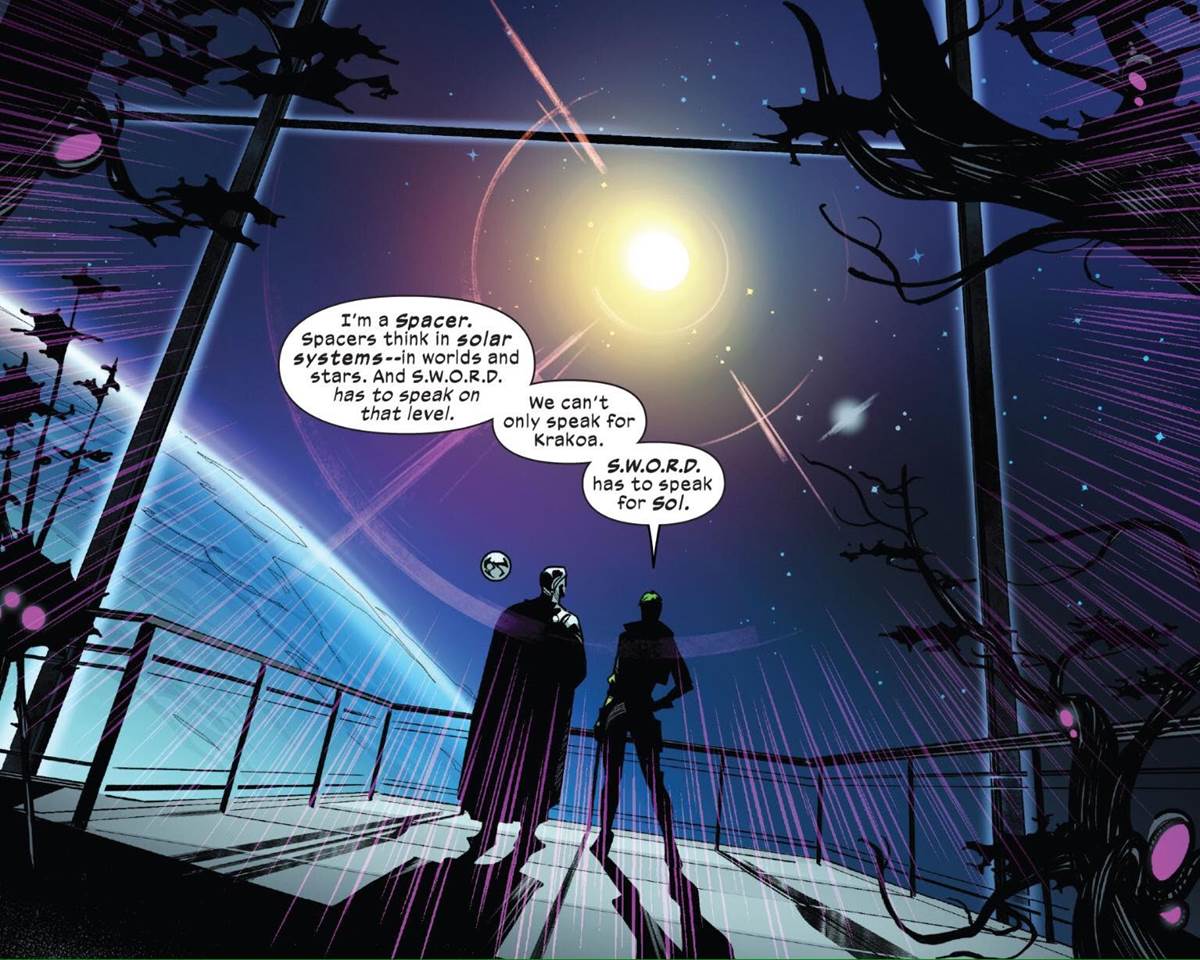 “S.W.O.R.D. #1” rebuilds the old space force dedicated to being Earth’s first line of defense against any kind of cosmic threat. Only this time, things are very different. This time, S.W.O.R.D. has a direct allegiance with the mutant nation of Krakoa and Abigail Brand is being very cautious about how that’s handled.