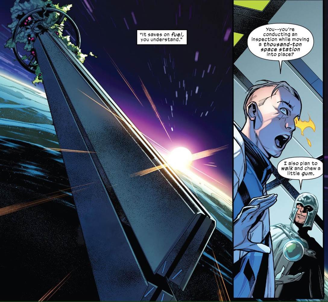 But what really wins me over in this panel, is Magneto’s response. Magneto is known as such a serious character with huge goals always on his mind. So for him to make such an easy quip in response to Cable’s shock and awe is hilarious. It’s also a reminder of just how powerful Magneto is, with how effortlessly he is literally moving a space station with his mind while multitasking.
