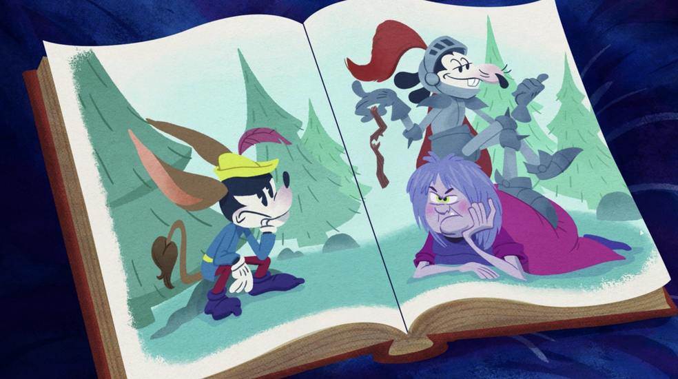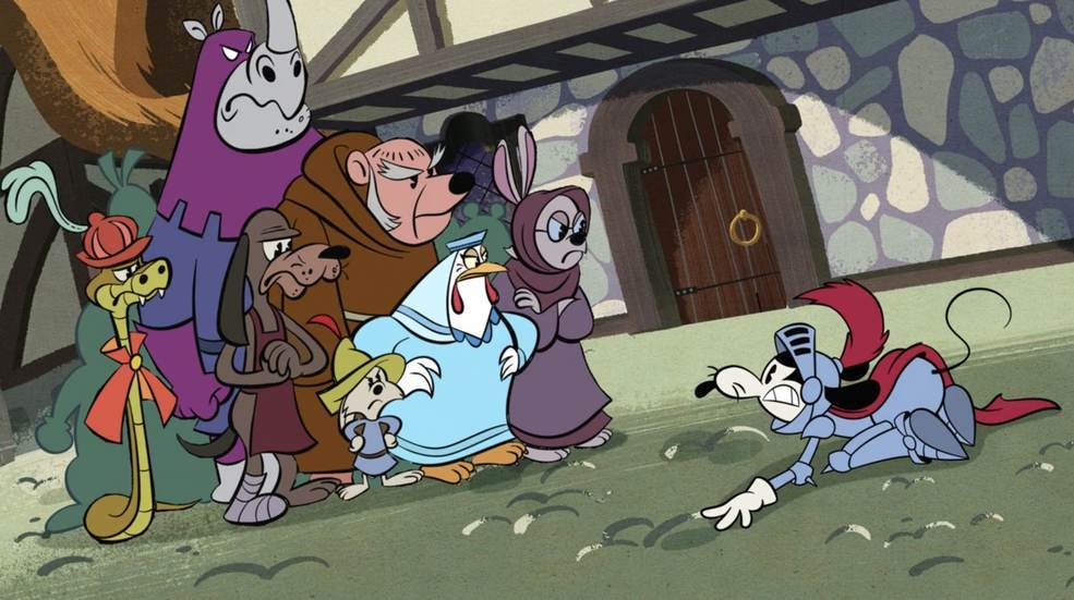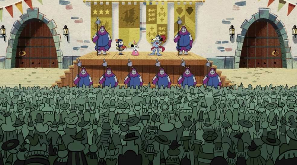 Mickey dreams of being the bravest knight in the kingdom and after an opening book sequence (narrated by Joanna Lumley, James and the Giant Peach), we see Queen Minnie on stage surrounded by royal guards, the rhinoceroses from Robin Hood. She is joined by Sir Mortimer, who has been Mickey’s rival ever since his short debut in Mickey’s Rival and he’s also appeared several times in the Mickey Mouse shorts series.