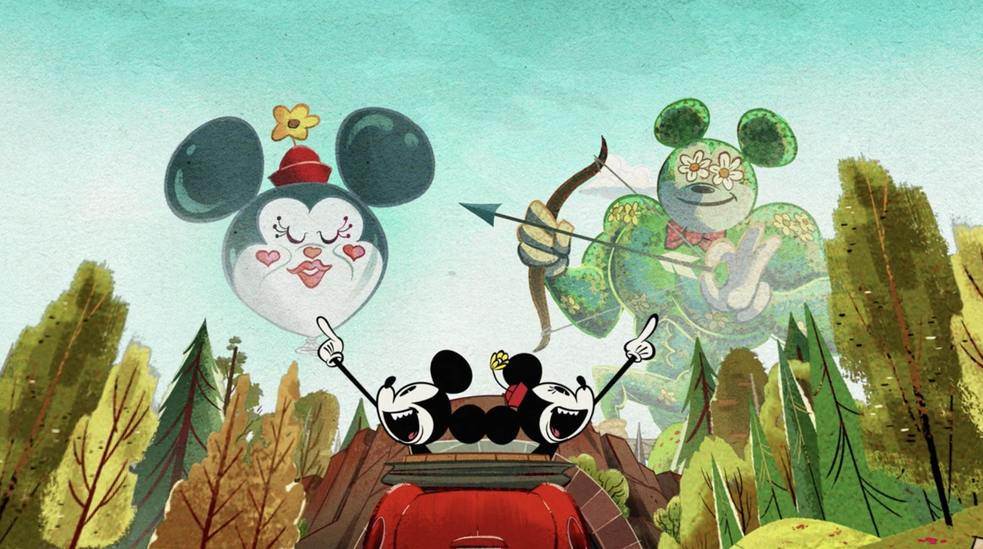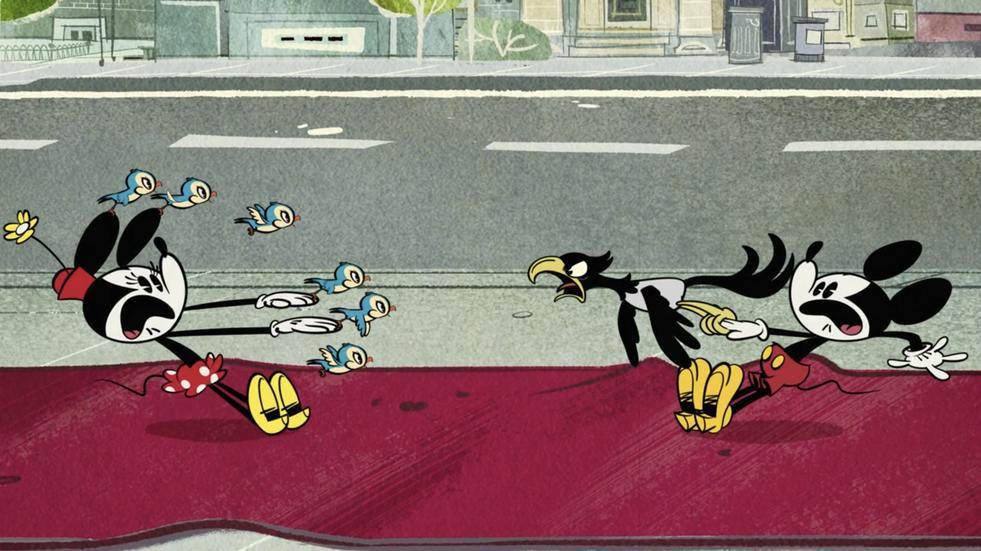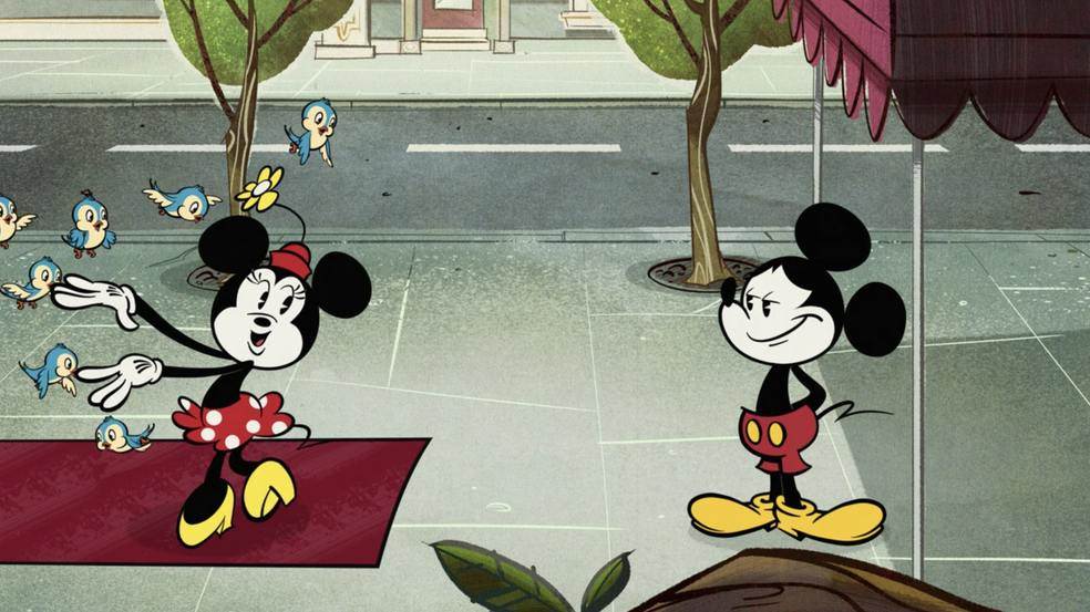 Once outside, Mickey’s bluebirds roll out a red carpet for Minnie and lead her to the car like Snow White.