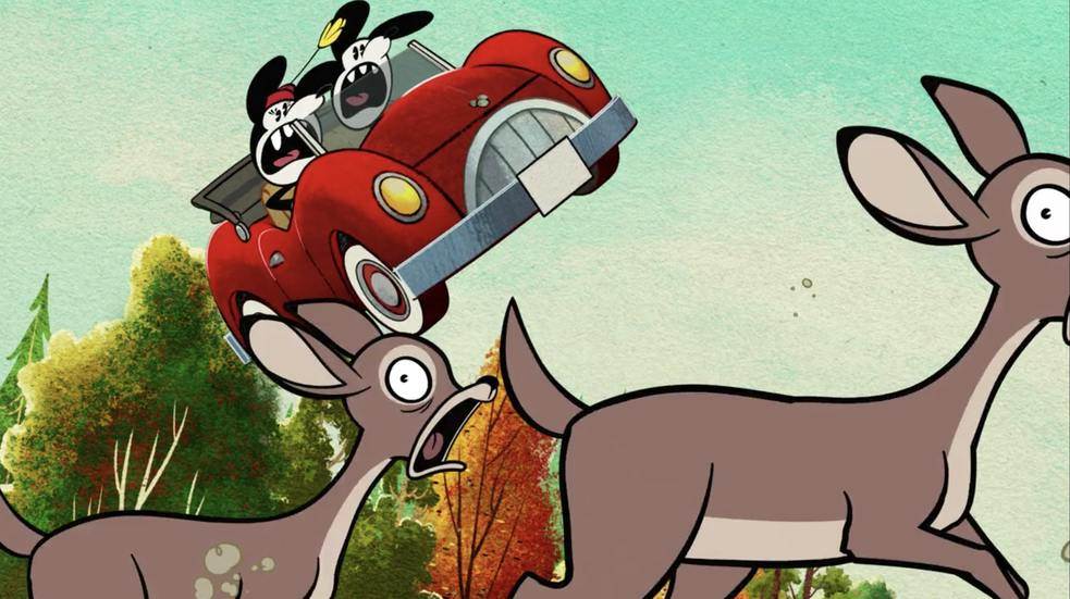 The resulting explosion scares the deer, which causes Mickey’s car to roll.