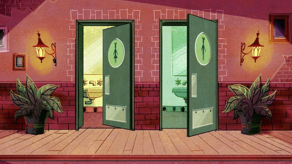 Mickey and Minnie both spill their dinner on themselves on purpose to run to the restroom to salvage try to make a plan to salvage their date. Look at the signs on each door!