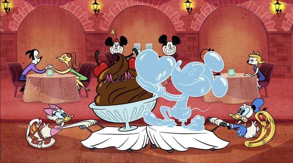 It all culminates in some indoor fireworks. Running for the hills, Mickey and Minnie realize they should’ve just told the other how much they mean to them. When Bestaurante Restaurant explodes, their table, dinner, and waiter land right in front of them, giving them the perfect ending to a crazy date.