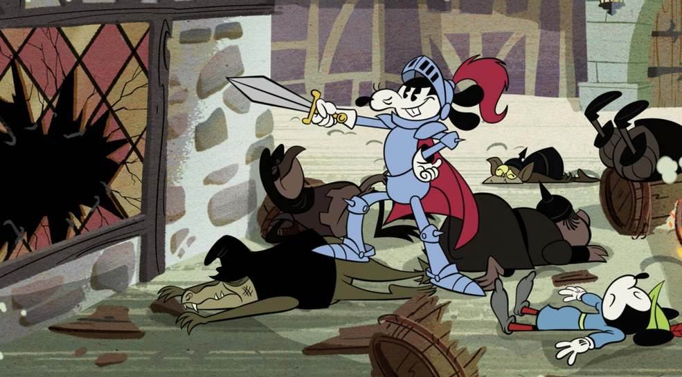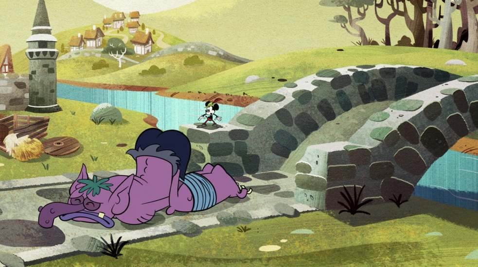 Shortly after starting his new gig, they come across a troll and Mickey retrieves Sir Mortimer’s sword, who refuses to take it. Thinking he’s receiving a lesson in knight strategy, Mickey plays the part of a distraction only to find that Mortimer has no plans to actually save him. Mickey ends up vanquishing the troll with his tail and the shirt off his back, but Mortimer gets all the credit.