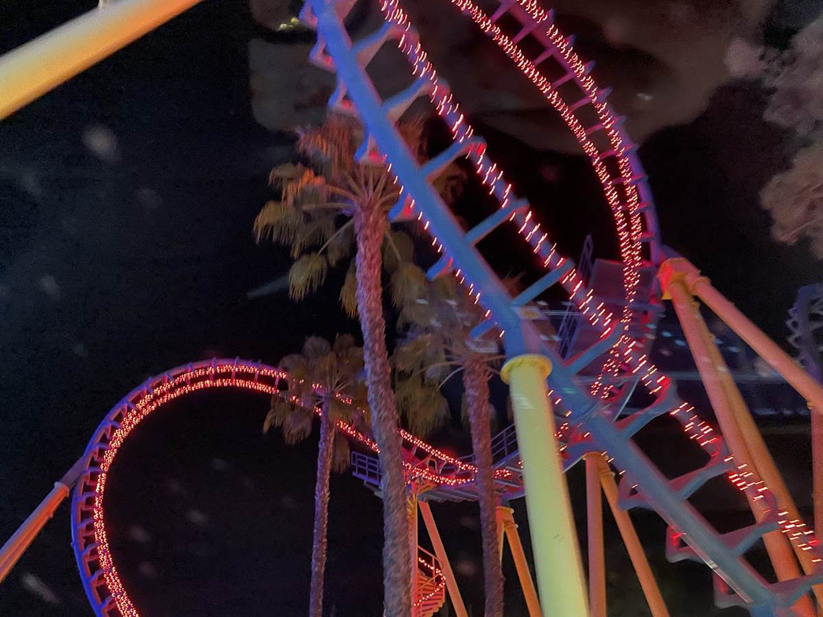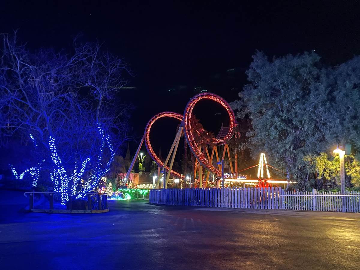 Perhaps the most impressive addition is holiday lights on one of the roller coasters, Boomerang.