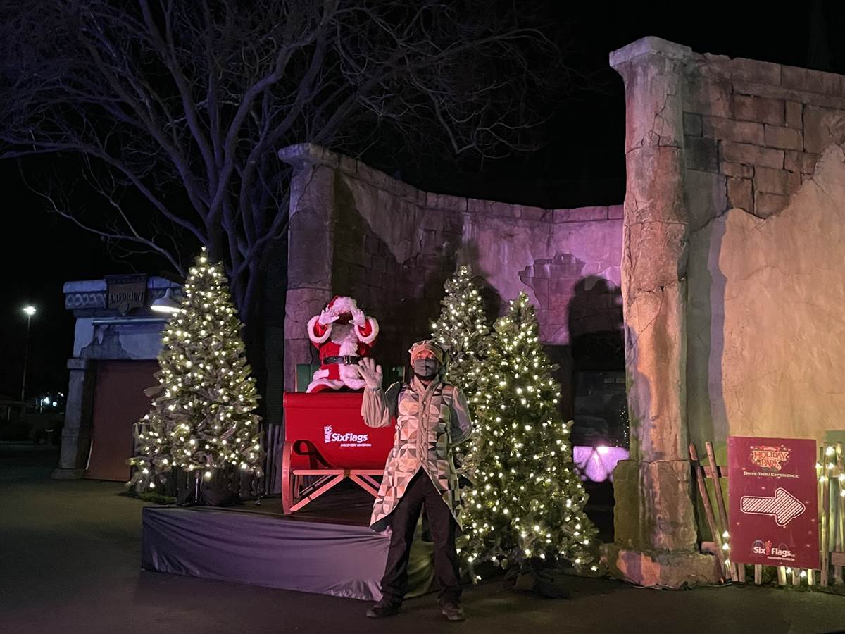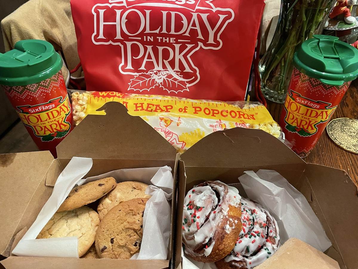 Your magical holiday experience starts at the main entrance underneath one of the park’s signature roller coasters. One of the ways you can enhance your experience is by purchasing snack packs and merchandise bundles in advance. A Six Flags team member safely delivers them to your car for guests to enjoy during their experience. The snack bundle includes hot cocoa in a souvenir mug, a bag of popcorn, holiday cinnamon rolls and cookies. Snack packs are available in quantities of 2 and 4.