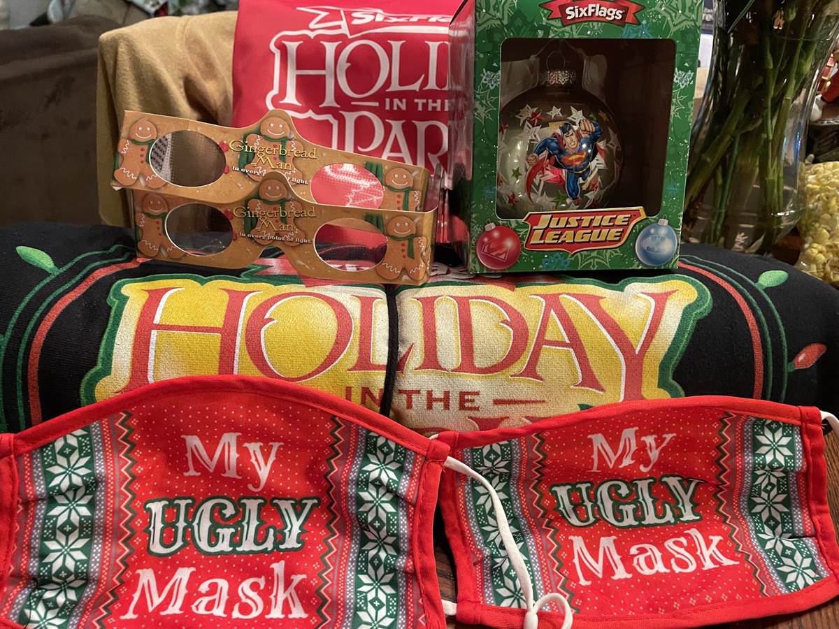 One of the merchandise bundles includes two face masks, a cozy sweater blanket with the Holiday in the Park logo, an ornament, and paper glasses that make all of the lights look like gingerbread men. It all came in a holiday drawstring tote bag.