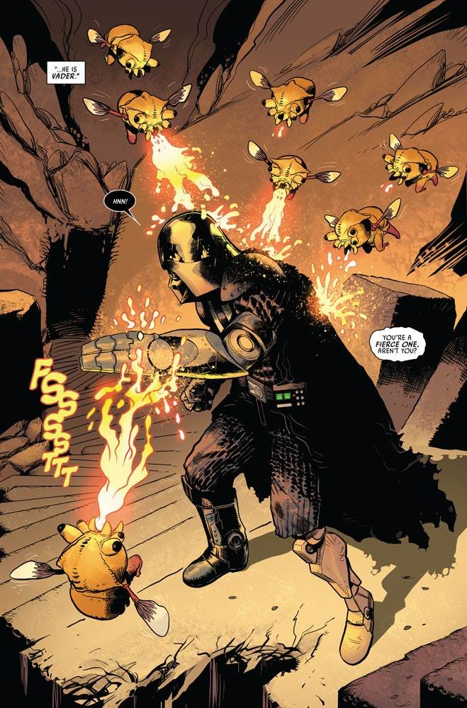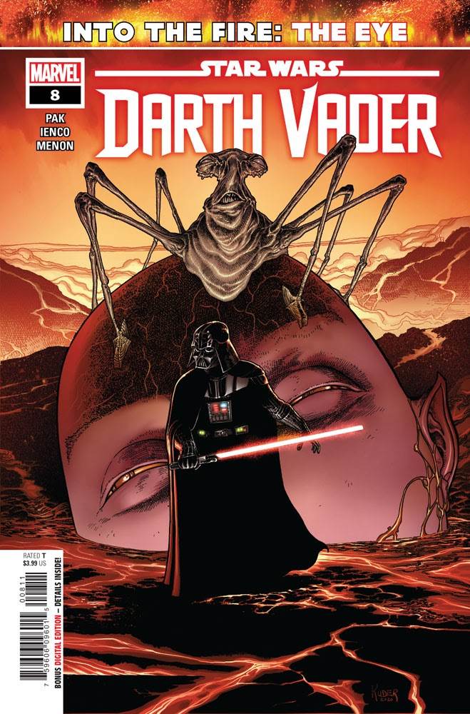 Star Wars: Darth Vader volume 3, issue #8 picks up where the previous installment left off, with Sith assassin Ochi of Bestoon (also introduced in The Rise of Skywalker) hunting Vader on Mustafar, though Vader has now been distracted by his Force connection with the Eye of Webbish Bog. Ochi fends off criticism of his technique from an Umbaran assistant to Emperor Palpatine while Vader enters a danger-filled lava cave in search of the Eye. We see the Dark Lord of the Sith go up against a variety of deadly creatures and endure emotionally painful flashbacks to his more recent duel with Obi-Wan on the Death Star, his confrontation with Luke on Bespin, and his ongoing (though strained at the moment) master/apprentice relationship with the Emperor.