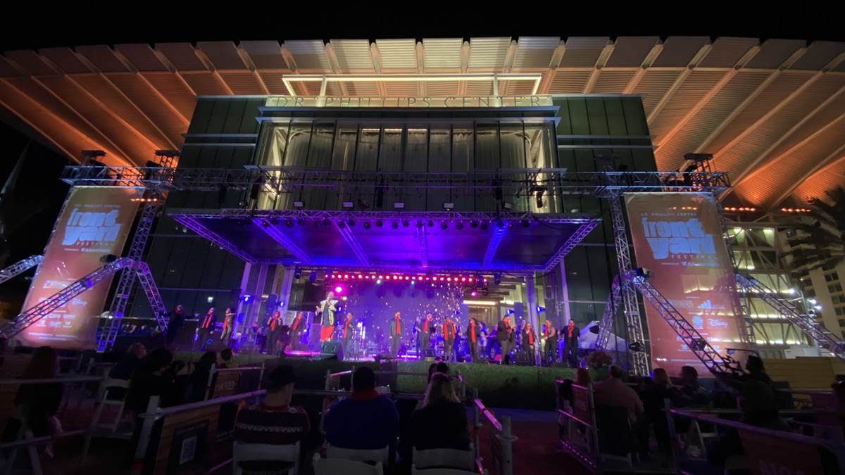 Dr. Phillips Center is currently hosting an event series known as the Frontyard Festival on the lawn in front of the main building, turning it into a temporary performance venue. The seating is composed of hundreds of boxes with four or five seats across the lawn to allow for social distancing from other parties. Each booth also comes equipped with a QR code for mobile ordering of concessions that are delivered directly to your booth to avoid congestion and lines at food stalls and merchandise stands. The series of the events ranges from concerts like this one, smaller performances, and screenings of classic films.