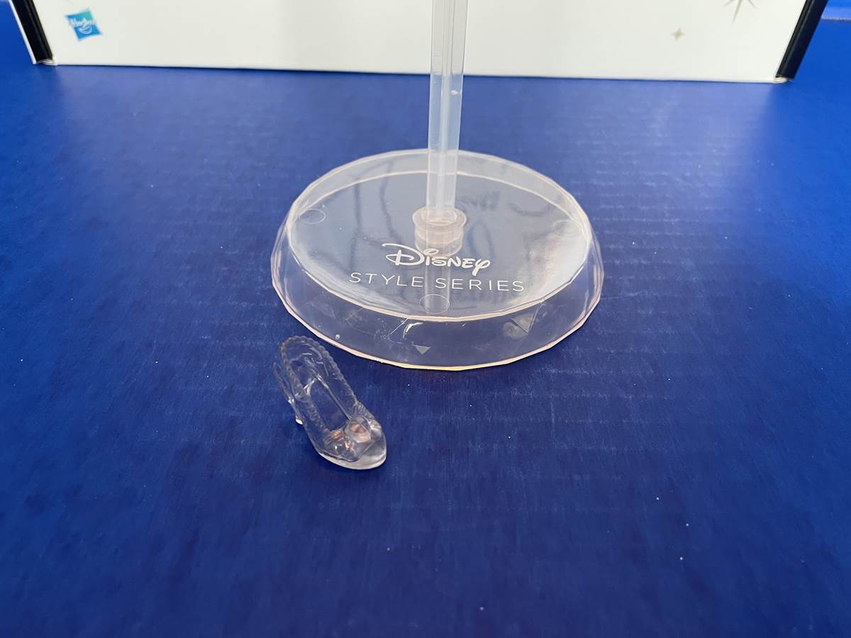 The base of the stand is faceted like a gem, but the glass slippers are one of the many highlights of the piece. They include filigree details on the sides and have her signature heart at the center.