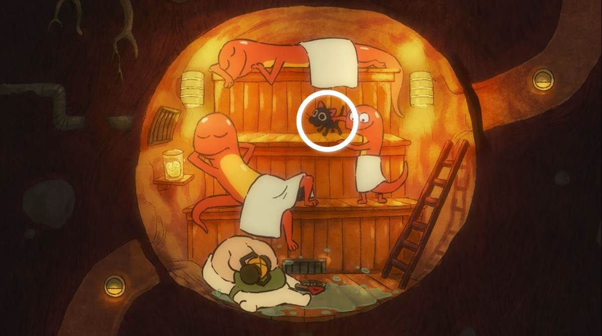 The new Pixar SparkShorts film Burrow that joined Soul on Disney+ also has an Easter Egg. During a quick panning shot through multiple burrows, Kitbull can be seen enjoying a steam room. In our interview with director Madeline Sharafian, she shared that Kitbull made it possible for her short to be done in 2D at Pixar.