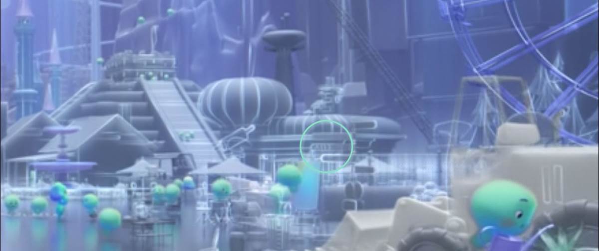 The Pizza Planet Truck is parked in “The Hall of Everything” along with a lot of items from past Pixar movies. Pixar loves to pull items from their digital archive to use in movies and in this single shot, you’ll also see Willy’s Butte from Cars, the Axiom from WALL-E, the ferris wheel from Toy Story 4, an Aztec building from Coco and The Spirit of Adventure from Up. There are likely even more in this shot and Pixar Post has some theories. We’ve only circled the Pizza Planet Truck in this image because it would otherwise be all circles!