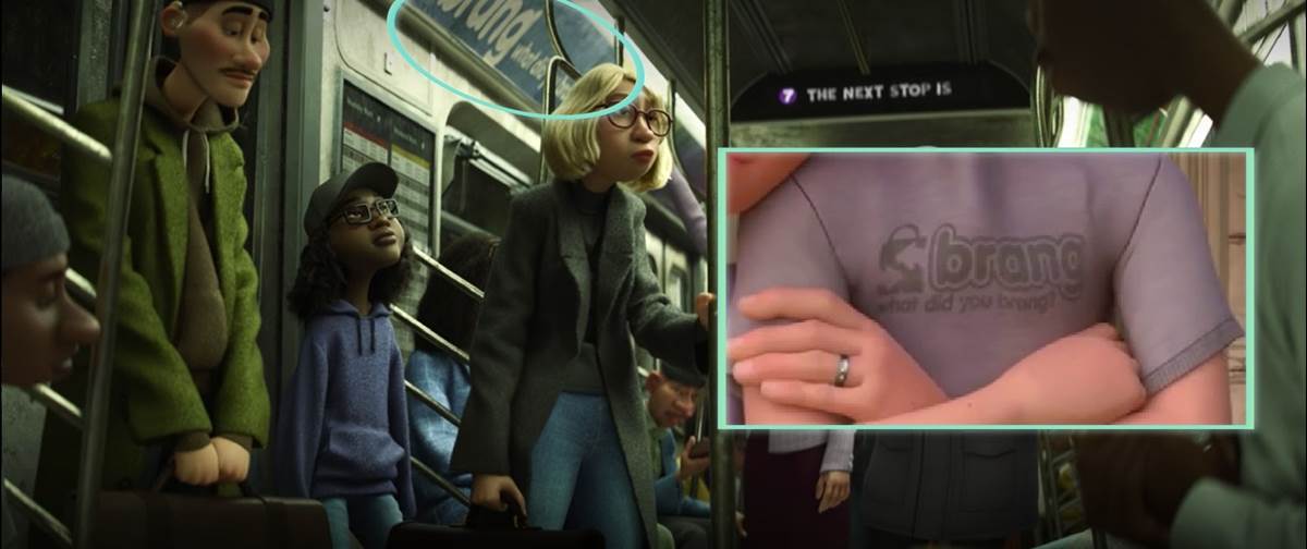 In another Pete Docter film, Inside Out, Riley’s dad works for a new startup called Brang and he wears their shirt with pride. They seem to be doing quite well because they now have the advertising budget to promote the company on the New York City subway. The full ad is never seen, but you get it in bits and pieces throughout the scene.