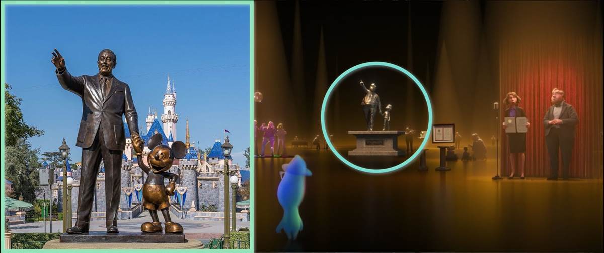 In Dr. Borgensson’s Hall of You, we see a statue has been erected for the famed psychologist where he stands pointing out with his right arm while his left holds the hand of a child. The pose is evocative of the Partners Statue found at Disneyland and Magic Kingdom in front of the castle where Walt Disney points down Main Street with his right hand while his left holds the hand of his most famous character Mickey Mouse.