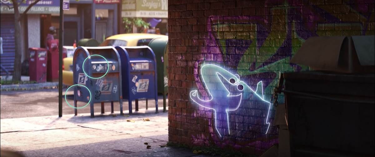 New York City is littered with stickers and these two repeat several times throughout the film. One is the BNL logo from Buy-N-Large, the superstore from WALL-E. The other is the face of André from the very first Pixar short,