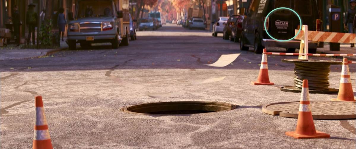 When Joe falls to his doom down an open manhole, a construction van parked nearby has the logo “RETLAW” on the back. RETLAW is Walter spelled backwards and was the name of the company Walt Disney created to own and operate the Disneyland Railroad, Mark Twain Steamboat and Disneyland Monorail. Pete Doctor is a HUGE Disneyland fan.