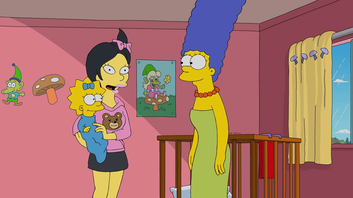 Ned Flanders (Harry Shearer) shows up for a last-minute dinner invitation that turns out to be a scam to get him to babysit Maggie, while Marge and Homer go to Moe’s Tavern for a trivia night, where they join CBG and Kumiko’s team. Moe (Azaria again) hosts trivia, but CBG doesn’t know any of the sports or vacuum cleaner-related questions, so he finds the Simpson parents to be surprisingly helpful in coming up with the answers. Their team “Han Shot First” and CBG toasts to “fat guys with hot wives.” Marge and Kumiko bond over wearing ponchos while their husbands eat dinner. She invites her new friend over to show off her housekeeping tips, but Kumiko is at a loss when tasked with taking care of Maggie. “I don’t know anything about babies except how to dress like one!” She ends up being a natural at calming Maggie with her singing voice, and she runs home to demand CBG impregnate her at once.