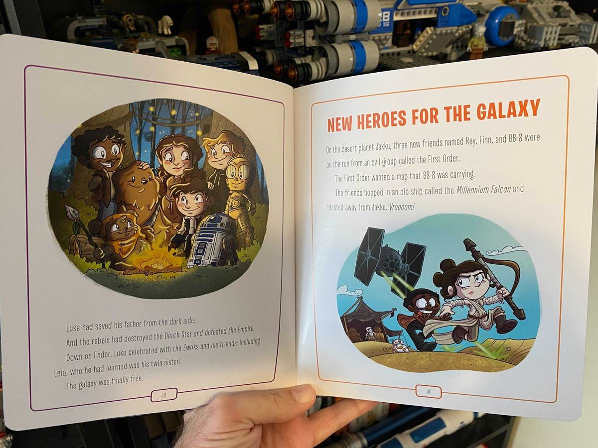 Star Wars: Galactic Storybook retells the entire Skywalker Saga utilizing an extremely condensed narrative and simplified text across six chapters: “A Jedi Tale” (adapting the entire Star Wars prequel trilogy) “A New Adventure” (the original Star Wars film, now known as Episode IV - A New Hope) “The Battle Continues” (The Empire Strikes Back) “Against All Odds” (Return of the Jedi), “New Heroes for the Galaxy” (The Force Awakens and The Last Jedi), and “The Final Fight” (The Rise of Skywalker). Each page contains a few short, easy-to-read sentences getting across the gist of the major plot points from these stories, accompanied by cutesy, cartoony full-colors drawings depicting each scene. I have to admit these illustrations aren’t really my style, though younger kids might find them appealing. The characters are wide-eyed and big-headed, the vehicles are plumper than we’re used to seeing them, and the backgrounds are simplified to better get across the basic focal points of these events.