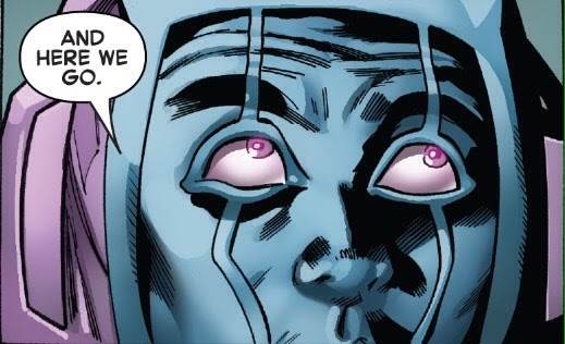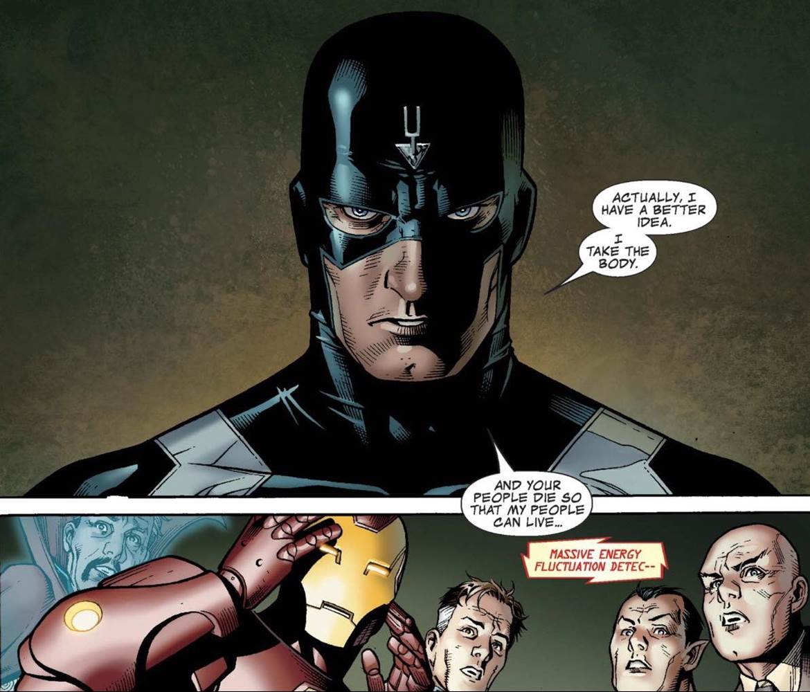 Black Bolt, the leader of the Inhumans and a member of the Illuminati, does not speak because the power of his voice could level entire planets. So when he opens his mouth here, naturally the other members are caught a bit off guard. This is the first moment in which our heroes realize they can’t trust anyone, leading to the “Secret Invasion” event.