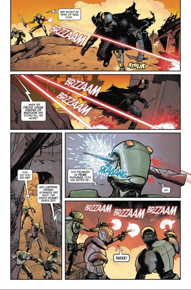 Picking up where Darth Vader #8 left off in December, this new issue opens with Vader still stranded on the lava planet Mustafar and being hunted by Ochi of Bestoon, the assassin who goes on to kill Rey’s parents later in the timeline (as seen in Star Wars: The Rise of Skywalker’s flashbacks).