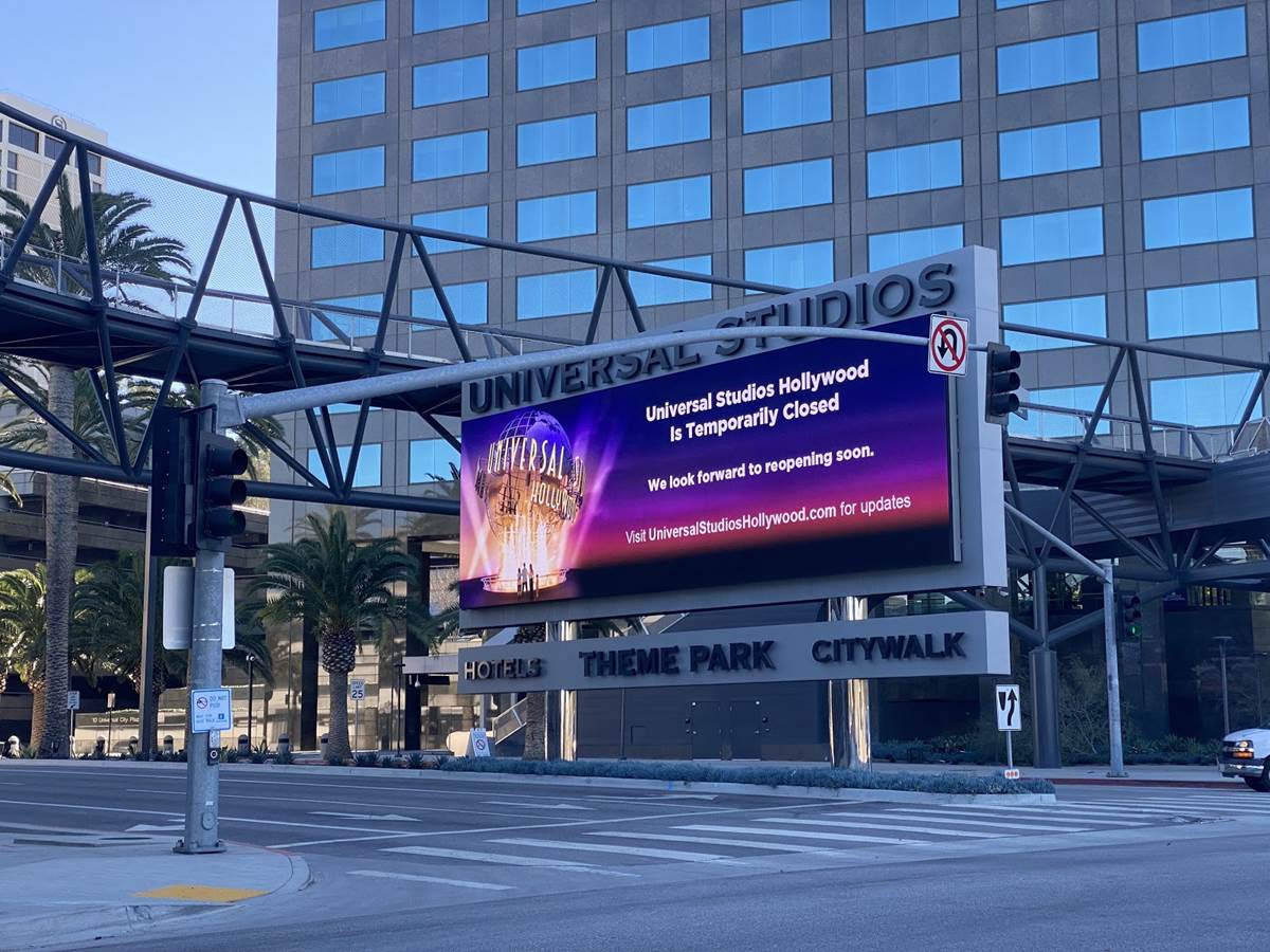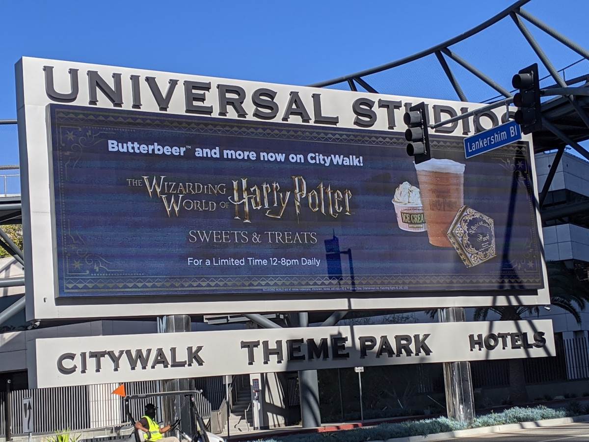 Outside the Universal Studios Hollywood, we found that the resort’s electronic billboards displayed some new images advertising the recently added Wizarding World of Harry Potter Sweets & Treats location and reminded potential visitors that the theme park itself is still closed for the immediate future.