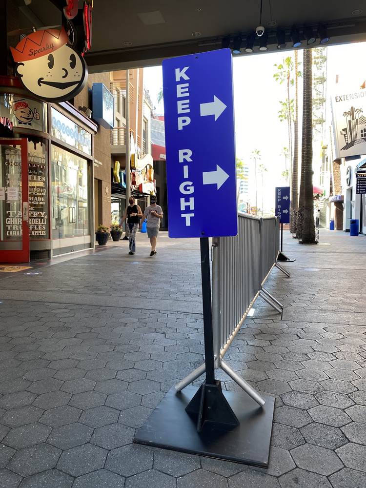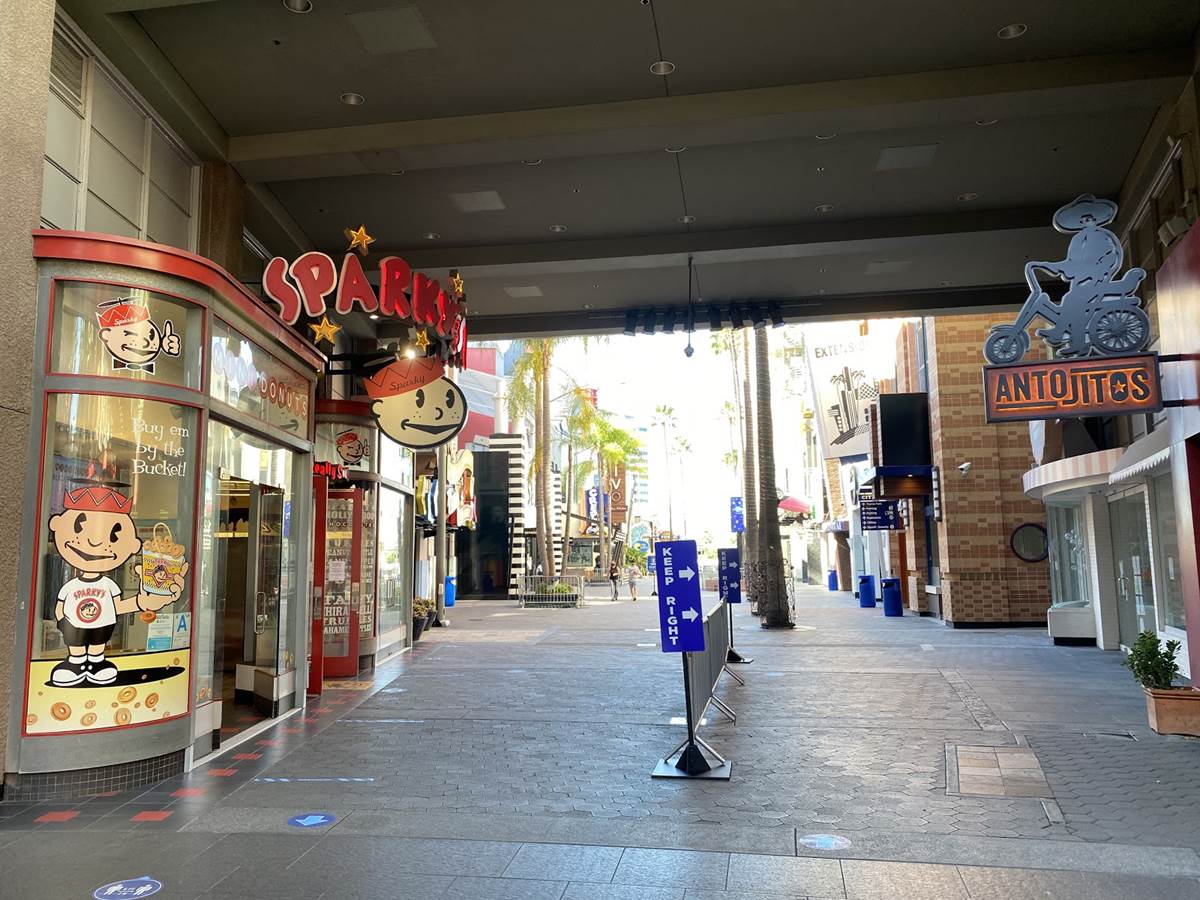 Inside, CityWalk’s central path has been divided in parts, encouraging guests to keep right as they walk through the shopping area, in an effort to better enforce physical distancing.
