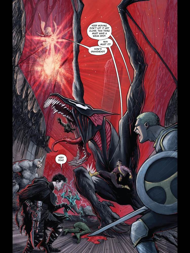 This panel perfectly captures all the hectic energy of this issue and complete lack of coordination put forth by this team of characters. The team drops like flies, with a symbiote dragon quickly eating one of them and their immediate reaction can best be described as panic. The matter-of-fact way in which they handle their teammate’s death is also quite hilarious.