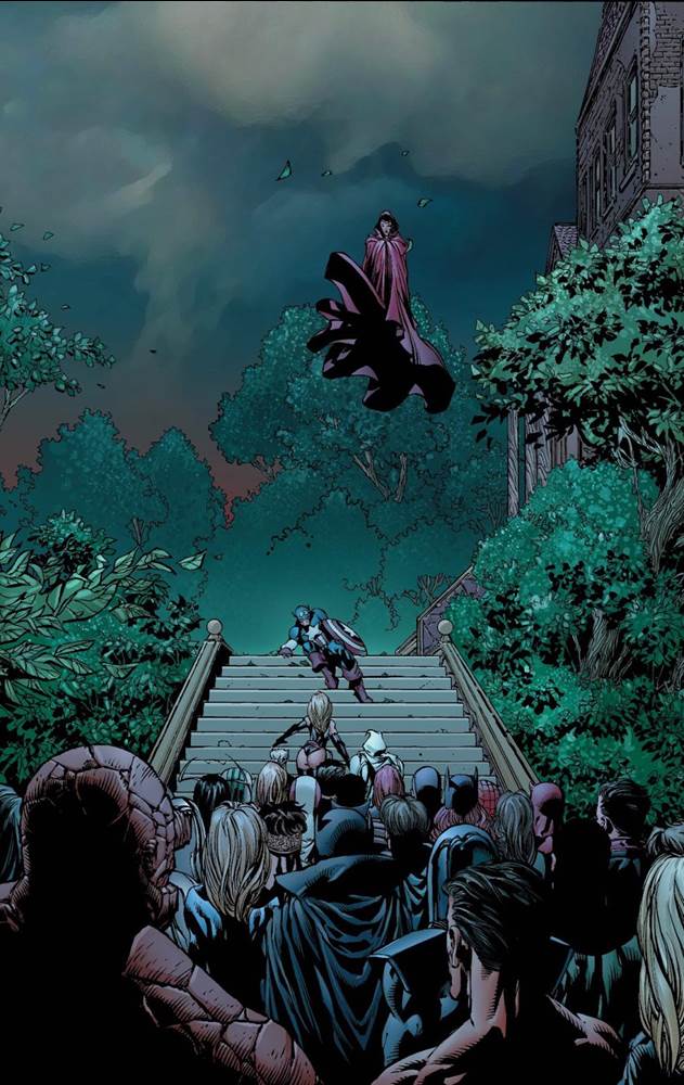 Cap is telekinetically thrown from the building, landing on the steps in front of the other Avengers. When Wanda follows him out, we get this incredible shot of her hovering over a fallen Cap as the other heroes look on. It’s the pivotal panel in a classic Avengers story arc, creating not only an incredibly important moment in the story, but also some amazing artwork featuring so many great characters.