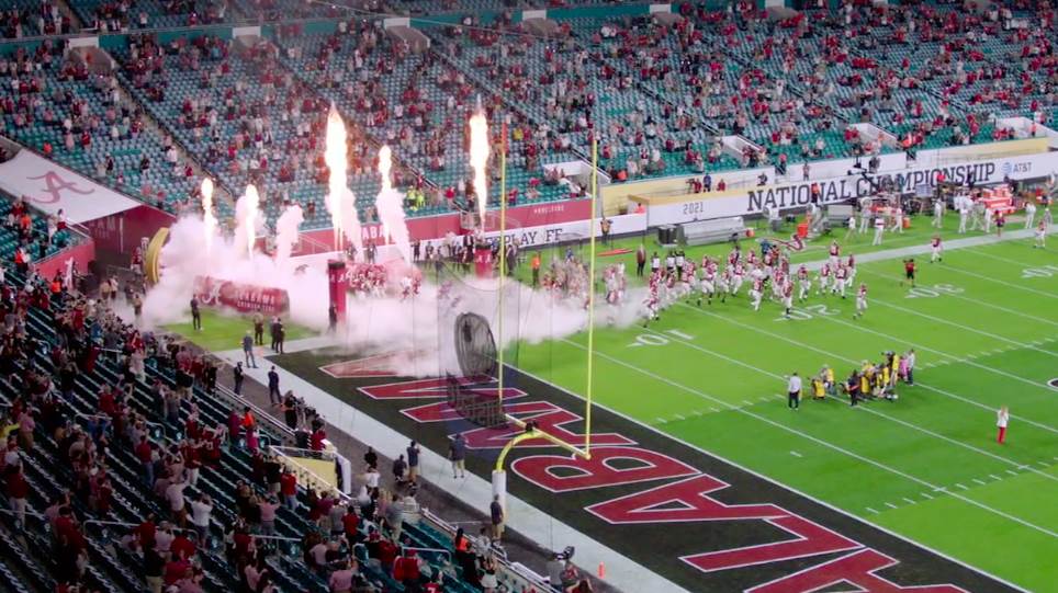 We then finally arrive at Hard Rock Stadium in Miami for the College Football Playoff National Championship game. We hear Coach Day’s pregame speech to his squad and see the two teams take the field to all the fanfare COVID protocols would allow.