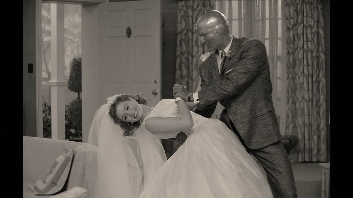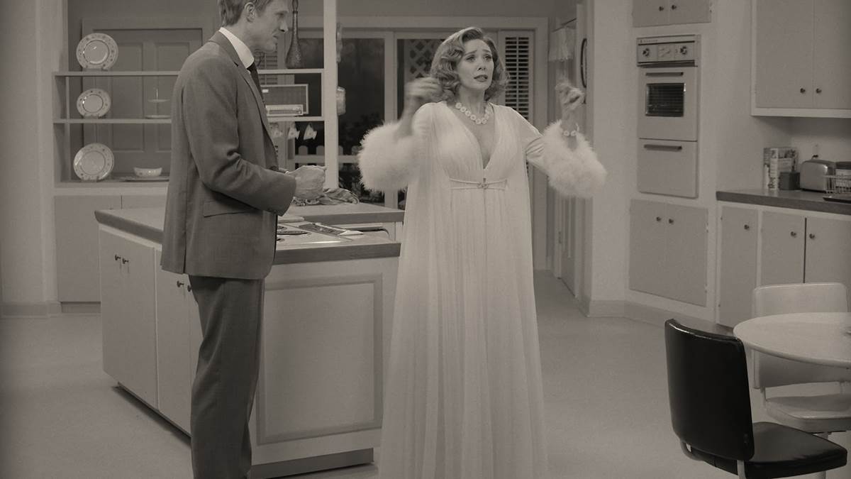 The episode opens with a classic 50s sitcom-style theme song and montage as the seemingly newlywed Wanda and Vision arrive in their new home. As the episode begins, Wanda uses her powers to clean up the kitchen. As Vision enters, a plate hits him in the head and shatters. The two make jokes about each other as a studio audience laughs, setting the tone for the rest of the episode. It doesn’t take long to realize that you’re very much watching a sitcom as opposed to an action-packed Marvel adventure.