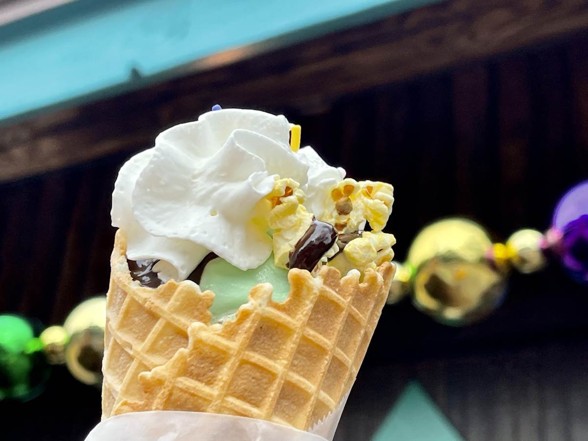 The Mardi Gras Waffle Cone Sundae - Kahlua Ice Cream Swirl, Salted Popcorn, Chocolate Drizzle, Whipped Topping, Sprinkles