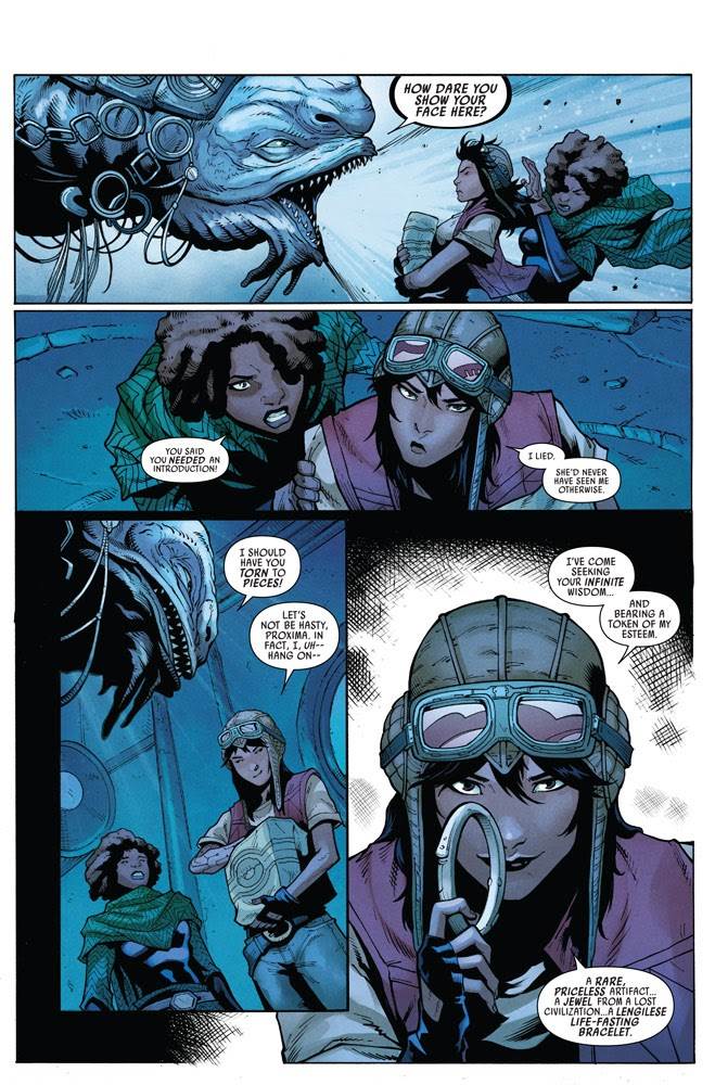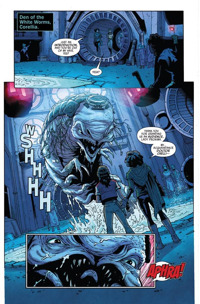This issue represents part 2 of the current “The Engine Job” arc, entitled “The Offer,” and in it Aphra pays a visit to Corellia (home planet of Han Solo, among other notable Star Wars characters), where her ex-girlfriend Sana Starros has holed up in her smuggler’s den. Sana finds Chelli squatting in her “crash pad” and is initially hesitant to accept her request to be accompanied into the lair of the worm-like crime boss Lady Proxima, first seen in Solo: A Star Wars Story.