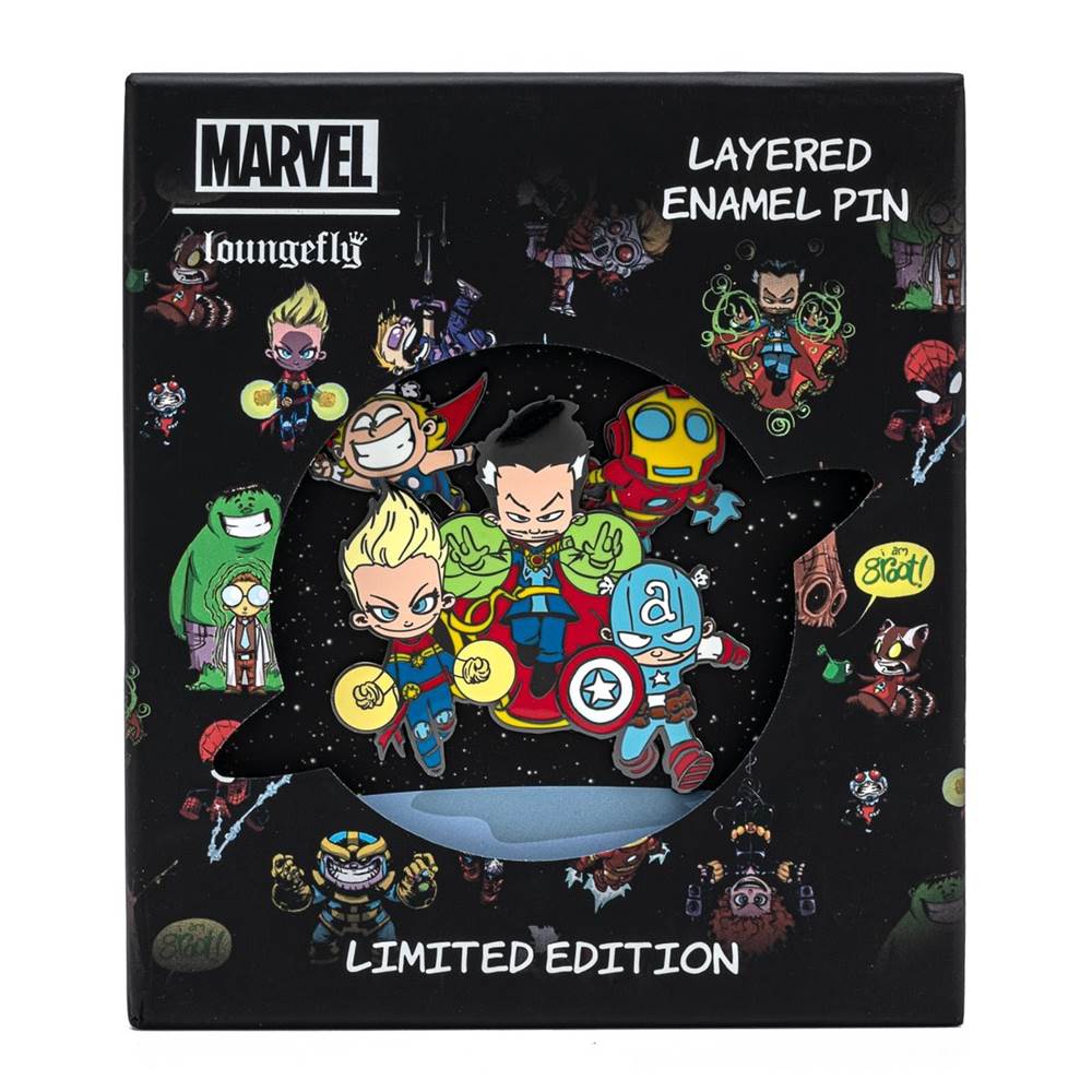 “Keep your favorite Marvel superheroes close with Loungefly’s Marvel Scene collection. Thor, Doctor Strange, Spider-Man, Captain Marvel, Captain America, and Iron Man move in to save the galaxy from Thanos’ next attempt to take over the galaxy.”