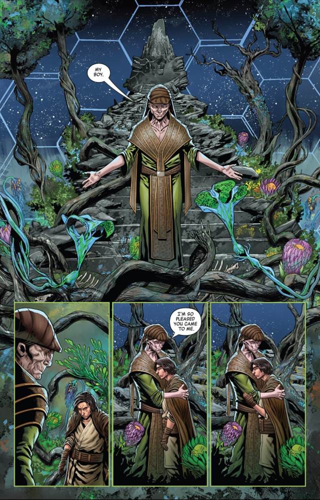 Early on in Into the Dark, a group of Jedi Knights and their hired transport crew arrive at an ancient, abandoned Amaxine space station after being detoured from their hyperspace route toward the ribbon-cutting event for a different, freshly constructed space station called the Starlight Beacon. The Amaxine station is made up of a giant center orb surrounded by metallic rings and overgrown with plant life. And as soon as I realized I recognized that the book, I ran to my comic book collection to fish out my copy of Star Wars: The Rise of Kylo Ren #1, written by Charles Soule with artwork by Will Sliney. Sure enough, the space station being used as a home base by eventual First Order Supreme Leader Snoke in the comics matched the description from Gray’s novel to a tee-- though at that point the station is only referred to as “Elsewhere,” teasing its cryptic nature. Exploring the Amaxine station further in the book, the Jedi even come across the imposing stone throne we see being used by Snoke in the comics when a young, disenchanted Ben Solo flees Luke Skywalker’s Jedi training academy to find solace under the tutelage of this mysterious being.