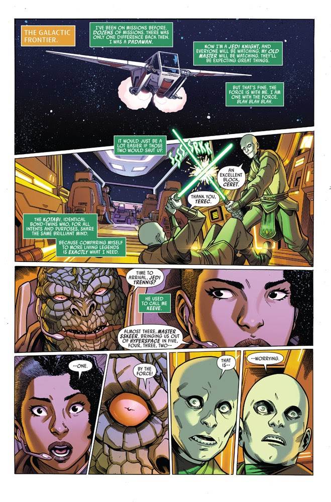 That issue also happened to end where the three existing novels in Star Wars: The High Republic (Charles Soule’s Light of the Jedi, Justina Ireland’s A Test of Courage, and Claudia Gray’s Into the Dark) also wound up: with the grand opening ribbon-cutting ceremony of the Starlight Beacon, a space station intended to bring order and a larger New Republic presence-- led by the Jedi-- to the Outer Rim. So now issue #2, out today, gets to take a bold leap forward in High Republic storytelling by showing us what exactly the Jedi headquartered at Starlight Beacon are up to after the space-dust of the Great Disaster has settled on the galaxy.