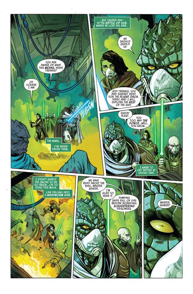 We pick up with newly knighted Jedi Keeve Trennis answering a distress beacon with her Trandoshan former master Sskeer (words cannot express how much I want a Sskeer action figure) and the idiosyncratic identical Kotabi bond-twins Ceret and Terec. Together they find floating in space an ambushed and pillaged Hutt vessel, which based on the evidence at hand they conclude had been attacked by the Nihil, a vicious band of marauders well-established elsewhere in High Republic continuity. This leads to paranoia and a frenzied conflict in the derelict remnants of the ship, plus a clue that sends Sskeer and Ceret to a farming planet named Sedri Minor, where they investigate the Hutts’ interest in one of the key ingredients in making the revitalizing liquid called bacta and begin to wonder why the residents there don’t seem to want the Jedi around.