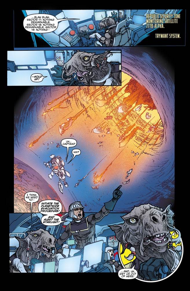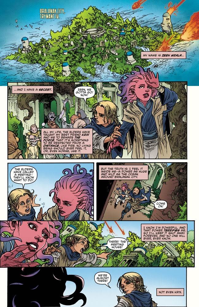 We are simultaneously introduced to two Force-sensitive youths who are hinted to have a hidden connection: Padawan Lula Talisola, who excels in her training but is hesitant about her ability to face real-world dangers, and Zeen Mrala, a resident of the planet Trymant IV, where her elders have always deterred their populace away from the Force and its powers. While Yoda and Chagrian Jedi Master Torban Buck stay in space to deal with the larger pieces of debris as they hurtle perilously toward the planet, the Padawans are sent planetside to help the locals and attempt to stage a mass evacuation before any real damage is done. There, the younglings encounter the Nihil (a militant band of marauders previously established in The High Republic continuity) and discover Zeen’s latent Force abilities as she reaches out to prevent a chunk of wreckage from crashing disastrously into Trymant’s surface.