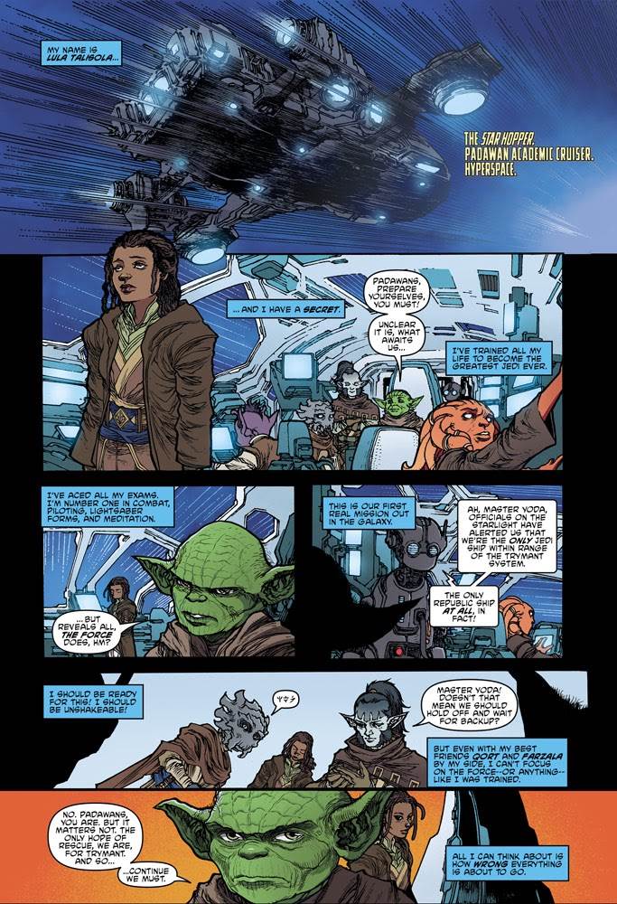 Like IDW’s other regular Lucasfilm-licensed title Star Wars Adventures, Star Wars: The High Republic Adventures is intended for a somewhat younger audience than the ongoing Marvel Star Wars comics, and with that in mind Older has chosen to focus its story on the younglings of this period: Jedi Padawans who are journeying with the now-only-700-year-old Master Yoda on an academic cruiser called the Star Hopper. Yoda and these younglings are “traveling the galaxy, learning about being Jedi” when they are suddenly forced to deal with a nearby emergency-- namely some localized fallout from the Great Disaster first depicted in Charles Soule’s adult-targeted novel Star Wars: The High Republic - Light of the Jedi.