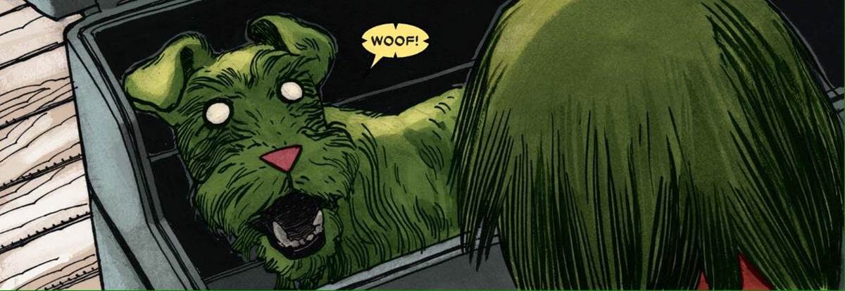 We jump back into the sitcom world where we see the twin hiding something in the kitchen sink. Wanda discovers that the boys have found a dog and ask to keep him. Vision enters in his human form. When Wanda asks him about his disguise, he explains he had a hunch someone might pop over. Right on queue, Agnes comes in the back door with a dog house, which Vision finds odd. Agnes asks the boys if they’ve named the dog yet and, after the dog somehow short circuits and outlet, suggests they go with Sparky. They of course stick with this name as Sparky is actually a synthezoid dog from the comics owned by Vision and his entirely synthezoid family. He does have a very different appearance in the show, however.