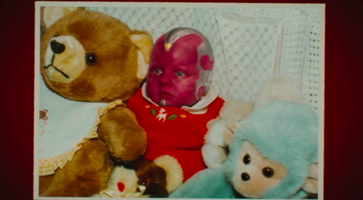 The intro features baby pictures of the two stars of the show and by that I mean Wanda and Vision. Yes, that includes a picture of a baby Vision, which of course never existed and is honestly a bit nightmarish. It’s also worth noting that Billy and Tommy wear clothes that mirror their looks from the comics.