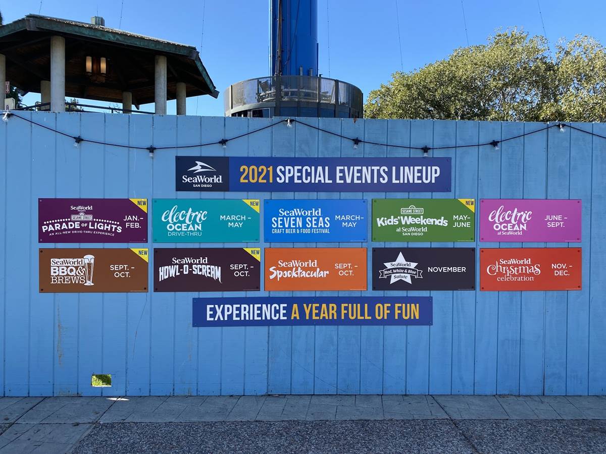 A construction wall in the theme park advertises SeaWorld San Diego’s ambitious 2021 special events lineup, with upcoming celebrations including the Electric Ocean Drive-Thru, SeaWorld Seven Seas Craft Beer & Food Festival, Sesame Street Kids’ Weekends, SeaWorld BBQ & Brews, Howl-O-Scream, SeaWorld Spooktacular, SeaWorld Christmas Celebration, and more.