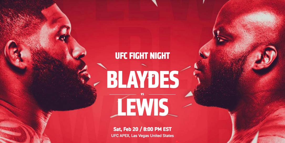 UFC Fight Night: Blaydes vs. Lewis will be held Saturday, February 20 at 8 PM ET. Fight fans can watch live on ESPN+.