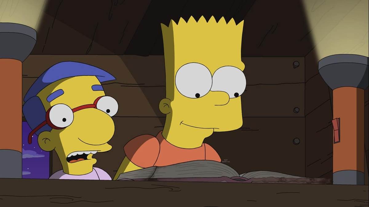 Bart and Milhouse use the old books to perform stunts to shoot on Milhouse’s phone for social media (though Milhouse holds his phone backwards and ends up only shooting video of his own face) and they discover that one of them is Edna Krabappel’s (the late Marcia Wallace) diary. Bart feels guilty about having this book after remembering that Flanders had once married his now-deceased teacher. Bart and Milhouse consider floating the diary down the river to dispose of it but are dissuaded when they witness Fat Tony (Joe Mantegna) and his goons getting rid of corpses the same way. They retreat to Bart’s treehouse where they begin reading Krabappel’s diary and discover where Superintendant Chalmers (Hank Azaria) hides his car keys. They steal Chalmers’s car and also find his coupons for free yogurt. Chalmers doesn’t get much help from Chief Wiggum (Azaria) and Lou (Désert) in retrieving his car.