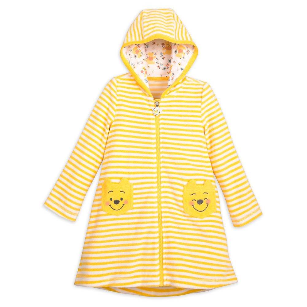 “Sunny smiles are assured when your little one dries off in this yellow and white striped hooded cover-up. The Winnie the Pooh face pockets on the front and bee zipper pull make this cozy wrap as sweet as honey.”