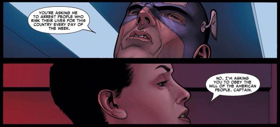 With the introduction of the Superhuman Registration Act, Captain America was the first to take a stand. When Maria Hill, then director of S.H.I.E.L.D., tried to get Cap to register, he of course objects. That leads to this incredibly powerful exchange and eventually a physical altercation.