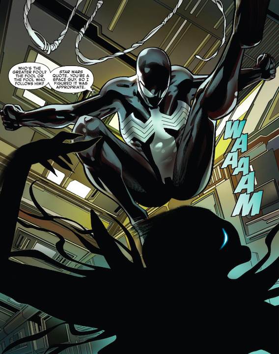 Whether it’s Miles Morales or Peter Parker, Spider-Man is always good for at least one hilarious quip in every issue. As he swings in to attack Mr. E (yes, that’s really his name) here, he decides to throw a Star Wars quote at the mysterious (oh, maybe it’s not such a bad name) villain.