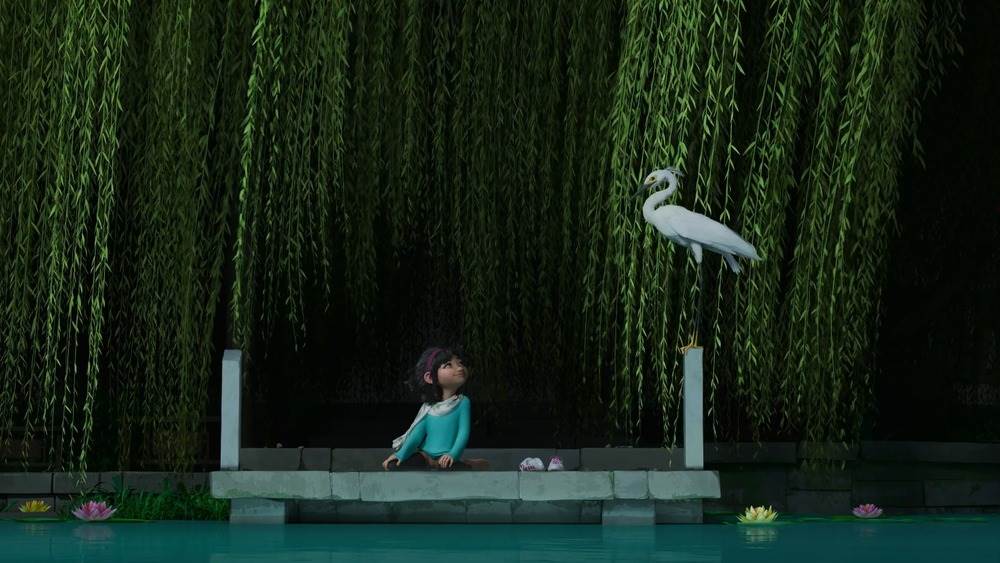 After Fei Fei's mother dies, she sits on the dock where they'd spent so much time together and wonders aloud what she should do to get her dad to postpone his upcoming marriage. She believes that her father should wait to be reunited with his late wife, as in the legend of Chang'e and Houyi. Fei Fei looks to the moon and sees a crane flying directly at it, prompting a musical number, and her eventual trip to the moon. Once Fei Fei returns home, she once again encounters the crane on the dock. After sharing a few seconds of eye contact, the crane takes off close to Fei Fei's head, grazing her hair with its wings. Guillermo asked Glen the question much of the audience was thinking, especially those familiar with the Chinese cultures and traditions. Is the crane Fei Fei’s mom? No definite answer was given. He even went on to say that the scene had dialogue in it, “when I first storyboarded that, Fei Fei was talking to her mom. And then we took all of that dialogue out and it played so much better. And her mother makes our appearance there, in that crane in a sense."