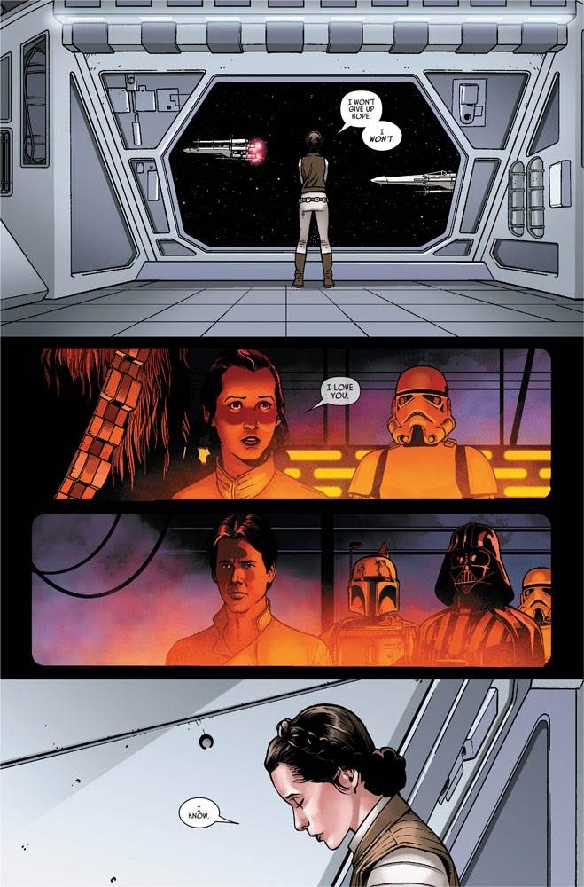 Star Wars #12 is Part IV of the “Operation Starlight” arc, and picks up right after Kes’s wife Shara Bey had become stranded and evidently lost on an Imperial Star Destroyer. During a lull in the action as they wait for Shara to potentially report in, Kes and Leia stare longingly out into space and reminisce together about their other halves. First we get a flashback to the casino planet Galator III, where Kes meet-cutes Share after successfully betting on the daring pilot in a dangerous crestrace. Then when prompted by Kes about the obvious difference between the princess and the smuggler’s personalities, Leia opens up about why Han appeals to her, as unlikely as it seems. She relates a tale about how the Corellian and his Wookiee pal saved Echo Base from total destruction when a reactor overloaded in the rebel hideout.
