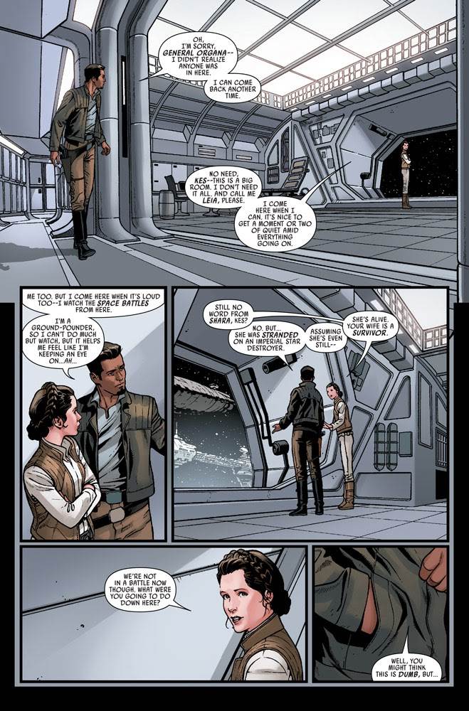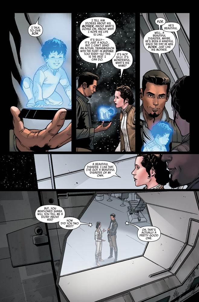 We also get a fairly charming story about how Poe Dameron’s parents first met each other, as his father Kes Dameron and General Leia Organa (Had she already been named general this early on in the timeline? I didn’t think so, but this comic indicates otherwise.) bond over their lost loved ones.